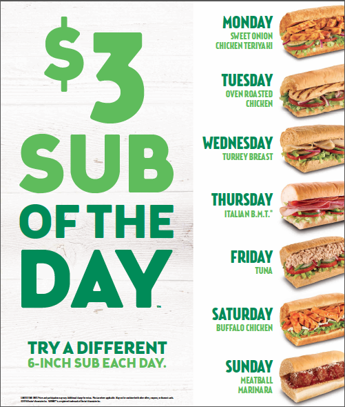 Order how you want, where you want. Prices and participation may vary. The subway sub of the day promotion does vary by location with local favorites sometimes being chosen over another sub in the weekly lineup. Each day of the week allows you to pick two subs every day at subway which saves almost 50% over regular prices of the sub. Jan 16, 2020 · the subway sub of the day is and was one of the greatest and most well known fast food promotions of all time.